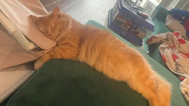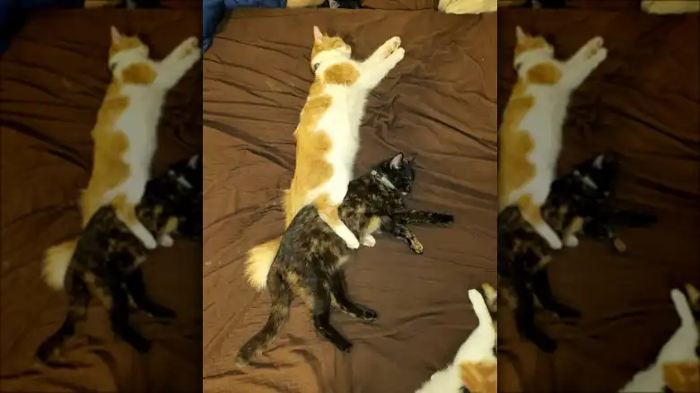 "Got them a heating pad bc it's been cold here and my Tortie has been like this for 3 hours and my orange just came and laid on top of her. They're obsessed."