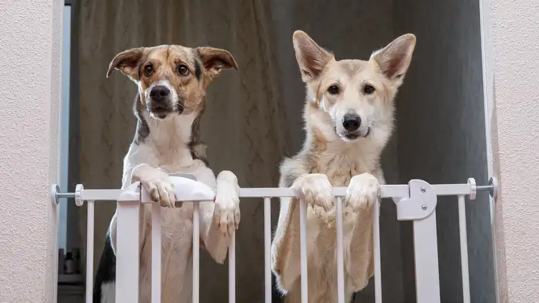 You could also put up a dog gate that still allows cats through, such as the Carlson Extra-Wide Pet Gate with Pet Door, to prevent your dog from accessing the part of your home where the litter box is set up. With this option, you don't have to worry about putting holes in your doors or installing a cat door. Remember, your cat will be able to clear the gate, so they'll still have free reign of the house, assuming all the doors are open. No matter what option you pick, keeping your dog out of your cat's litter will keep your dog's tummy — and your household — happier.