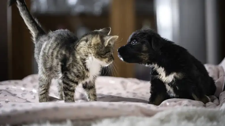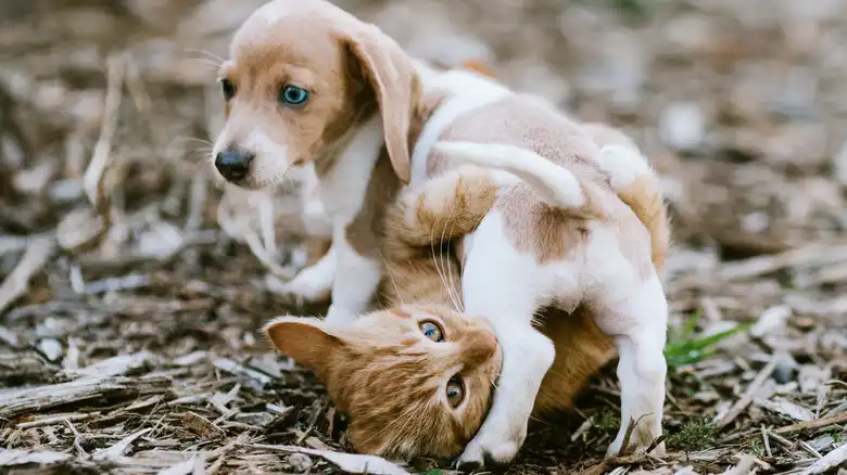When cats and dogs play together, you may notice some crossover; both could chase and wrestle. Yet the two won't necessarily understand each other's body language and when they're pushing the other too far. A dog tail wave is a sign of happiness; it is the opposite for a cat. They require time to figure out these signals, and until they do, you need to supervise any play and look for the signs of aggression highlighted above.